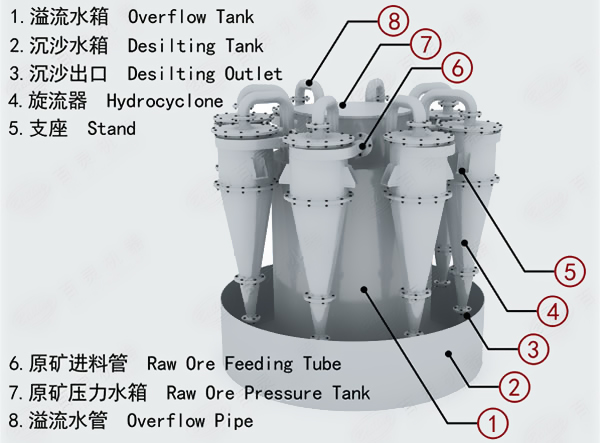 水力旋流器結(jié)構(gòu)設(shè)計獨特,采用多段式柱體復(fù)合結(jié)構(gòu),可根據(jù)需要增減柱體高度,若高度增加,溢流細度提高,可達10微米左右;并且每個直徑都有獨特的筒體長度和錐角組合,可在最小的總旋流器長度情況下達到最大的切線速度,從而增大物料的離心力,提高分級效率。